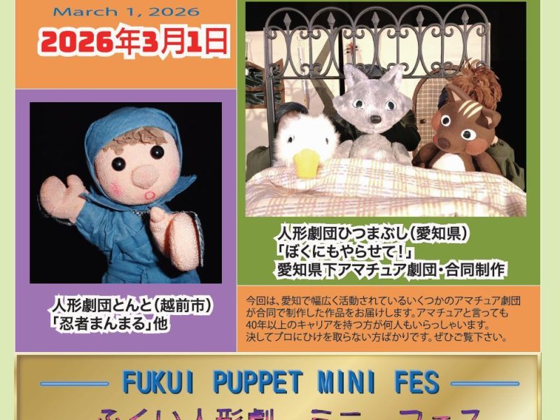 愛知人形劇センターのアマチュア支援事業・人形劇団ひつまぶしが、福井で公演します。福井で活躍されているプロ劇団・人形劇団とんととのジョイント公演。 日時/2026年3月1日(日)13:30~ ふくい人形劇 ミニフェス 人形 …
